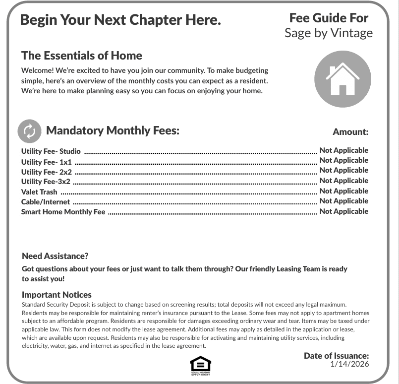 Rents shown below are base rent and do not include any additional mandatory or voluntary fees and charges. Please contact our community for more information on such fees and charges.
